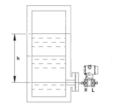如圖所示,高壓室法蘭與容器低端法蘭相接,而低壓室法蘭安裝在與高壓室法蘭同一水平線上的大氣中。那么變送器量程為L(zhǎng)=H·ρ