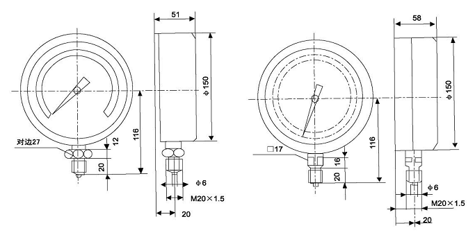 精密壓力表的外形尺寸:
