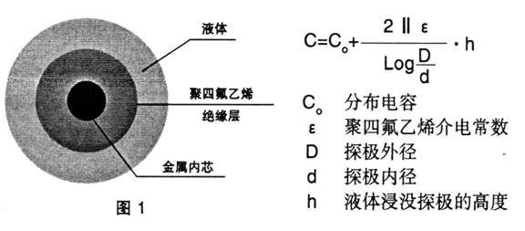 射頻電容液位變送器測量原理為探級與導電液體構(gòu)成一電容器,其中探級線的金屬內(nèi)芯為電容的一極,導電液體為電容的另一極,中間為高穩(wěn)定性的聚四氟乙烯,即探級線的絕緣外層作為兩極之間的介質(zhì),隨著液位的變化,液體包圍探級線的面積隨之改變,使構(gòu)成電容器兩極的相對面積改變,導致電容的變化,根據(jù)同心筒狀電容的公式可寫出液位高度與電容的關(guān)系: