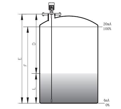 通過輸入空罐高度E(=零點(diǎn)),滿罐高度F(=滿量程)及一些應(yīng)用參數(shù)來設(shè)定,應(yīng)用參數(shù)將自動(dòng)使儀表適應(yīng)測(cè)量環(huán)境。對(duì)應(yīng)于4~20mA輸出。